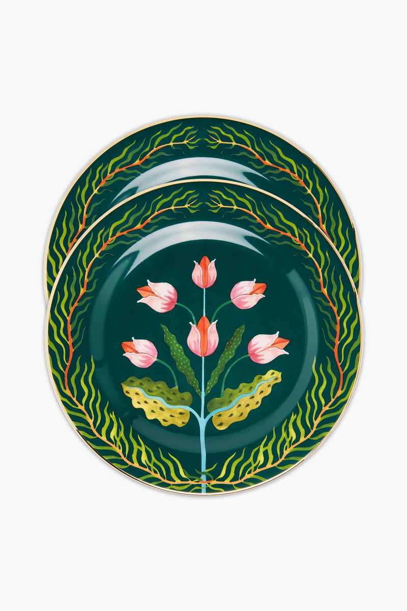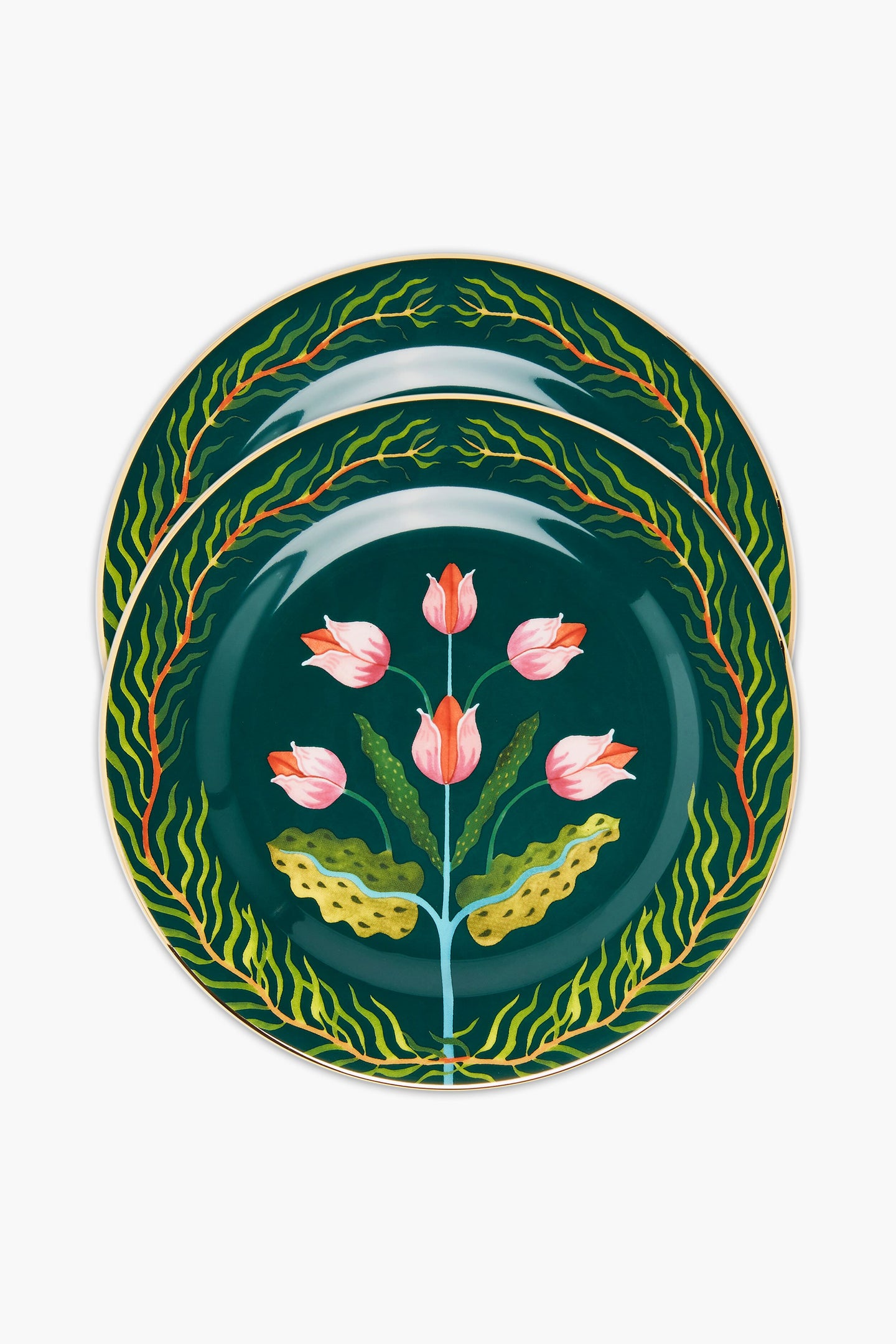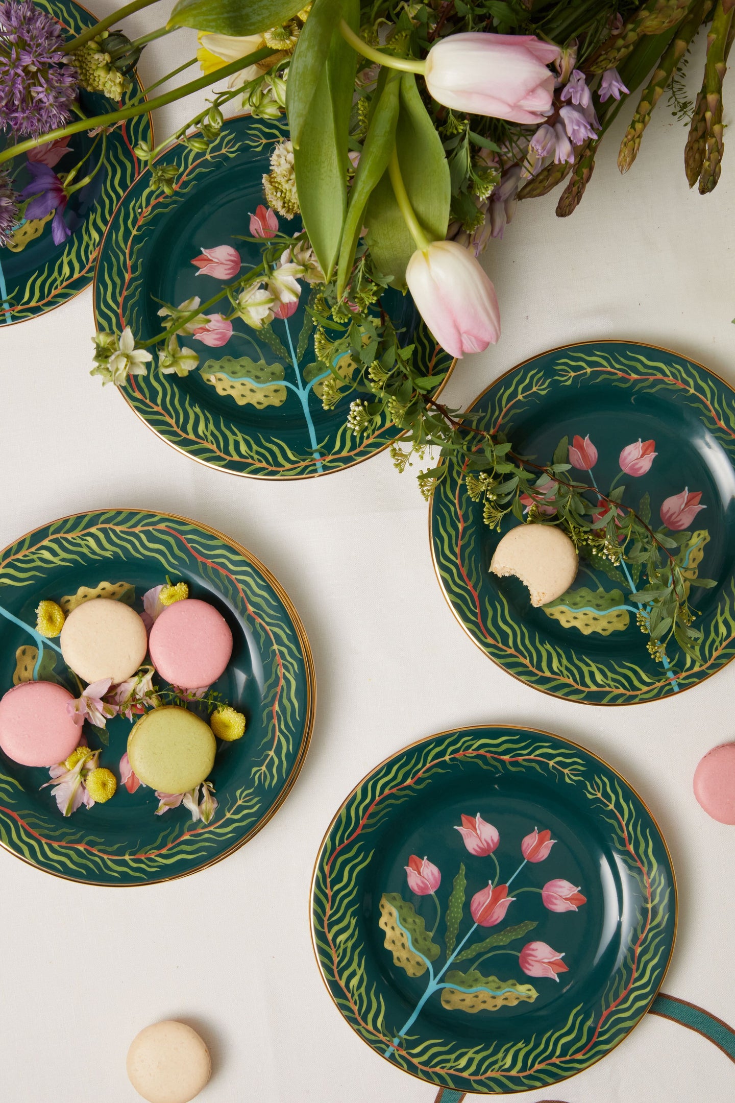The Tulip Dessert Plates is a delightful addition to your table setting. Crafted from fine porcelain with hand painted gold trim, this set of two features a beautiful print that can be styled as a solo statement to bring a jolly jolt to your white china and plain table. Great for a gorgeous gift, these plates do double duty, so snag a few for your salad course or dot around your home as a handy spot for keys or crystals as well.