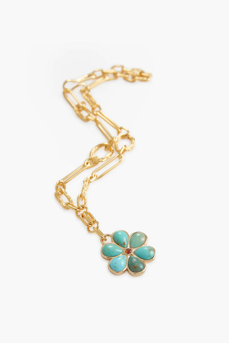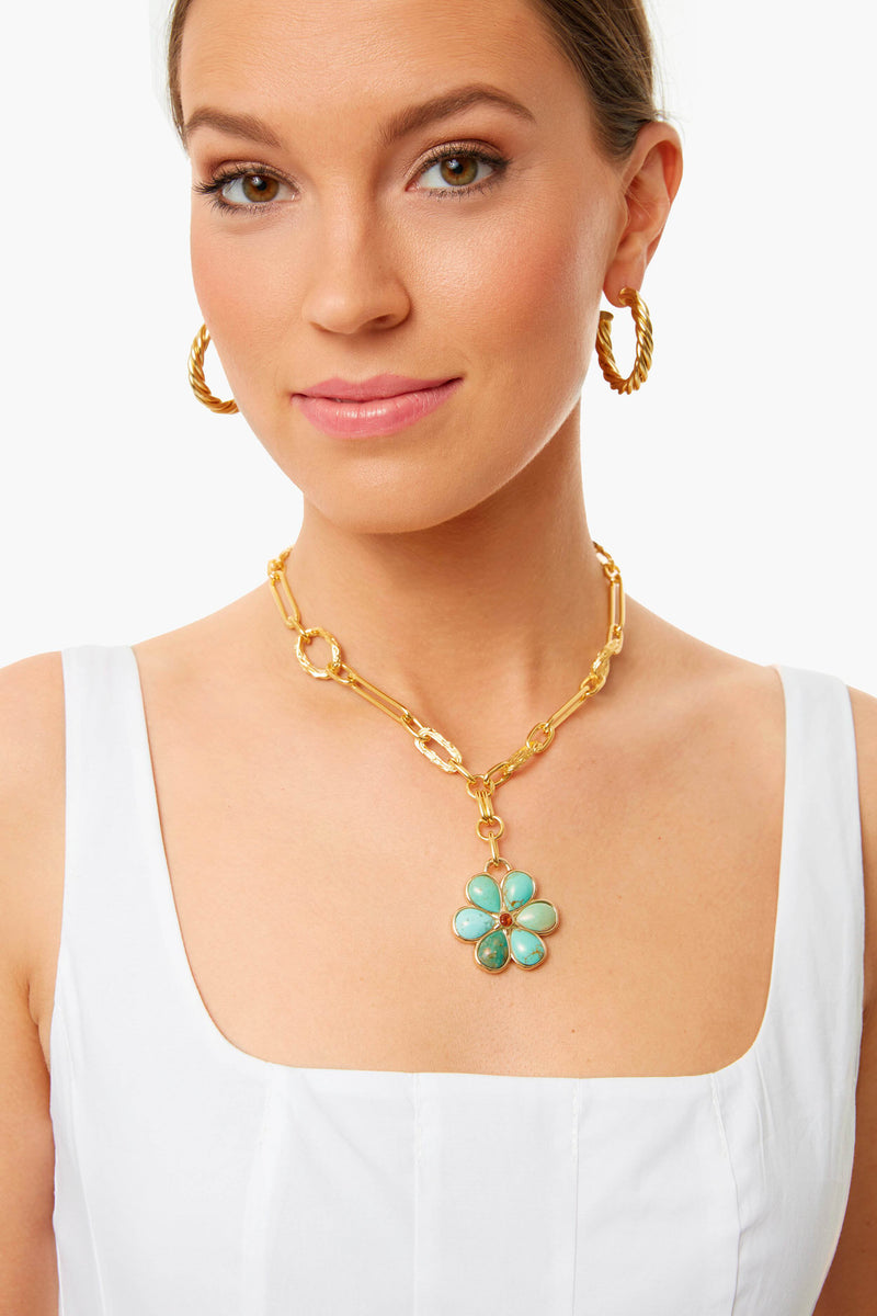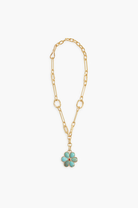 There's no chance of being called a wallflower in this statement-making gold-plated chain link necklace. With a cheerfully graphic 6-petal daisy pendant set with turquoise stones and faceted citrine cabochon, the Turquoise Desert Daisy Necklace is the perfect accent to all your looks this season!