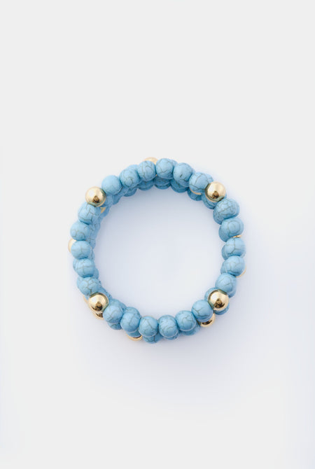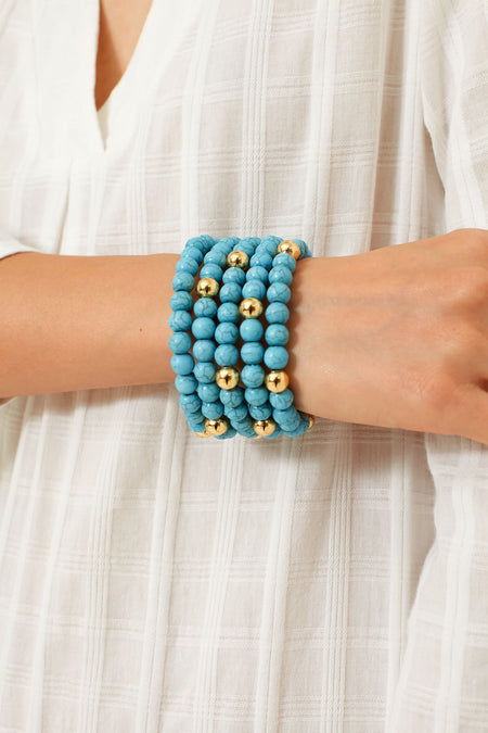 Add the perfect pop of color to any ensemble with the Lena Stacked Bracelet. Featuring five strands of turquoise beads with gold beads in between, this beachy number is stretchy with attached strands for an easy and chic look. Perfect for wearing it with a coverup on vacation or a classic button down and jeans for added feminine flair.
