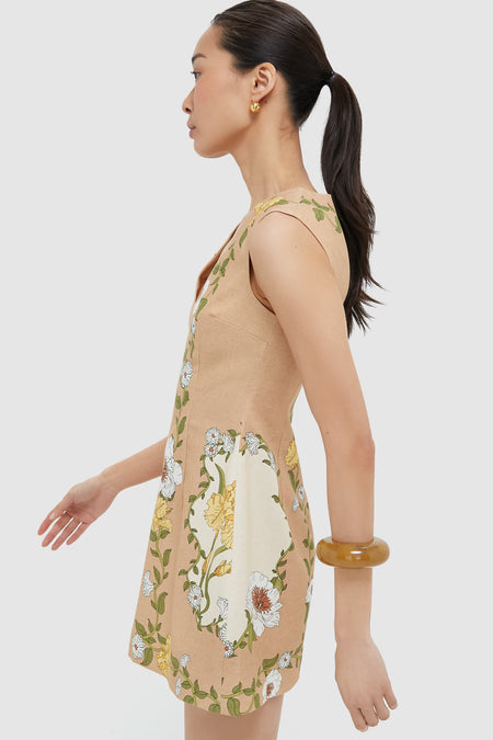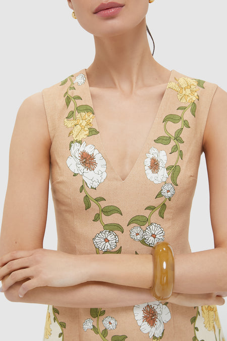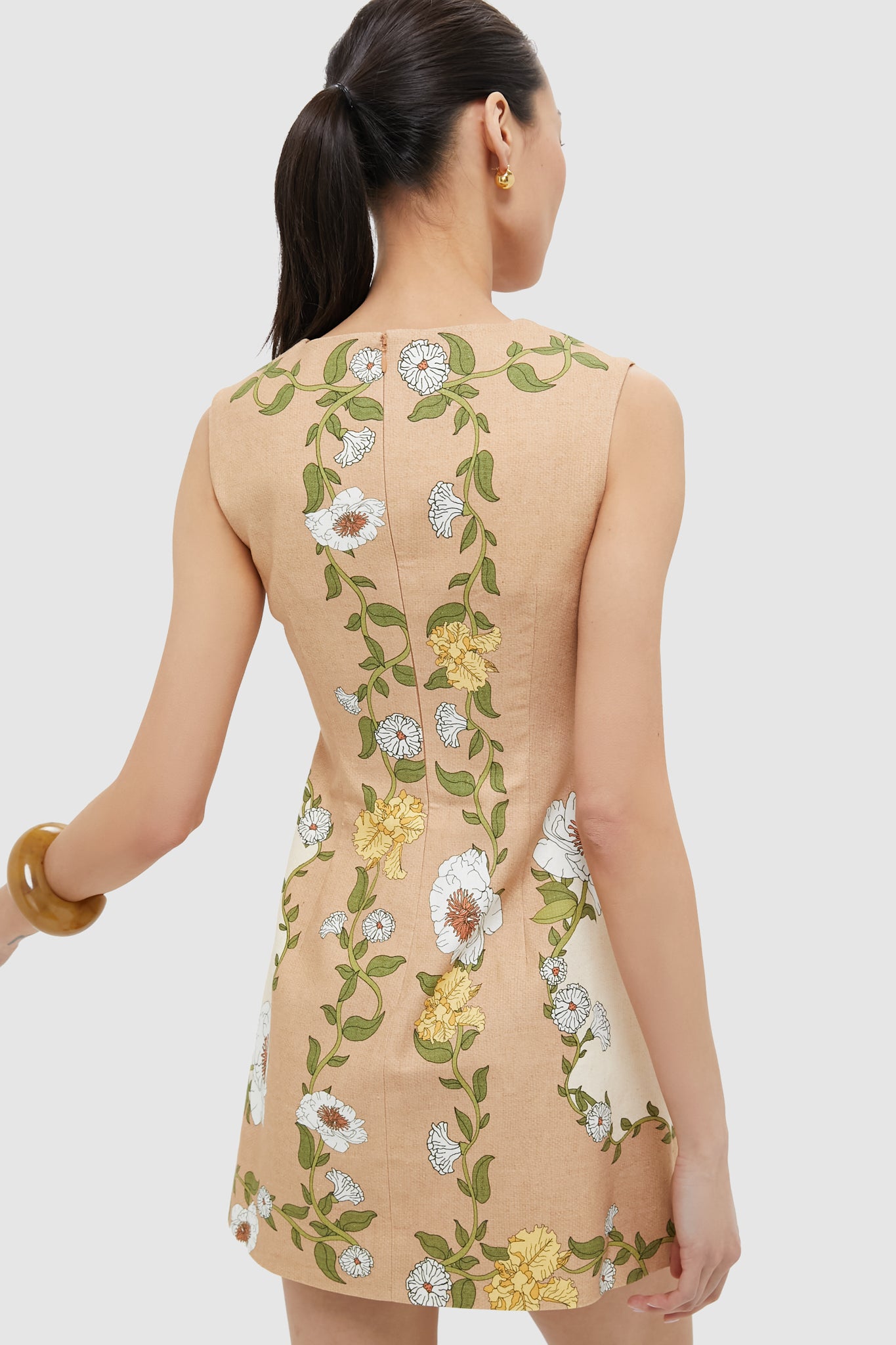 The Verona Floral Rivera Mini Dress is an elevated mini featuring a floral placed print, to frame the neckline and fall to the hem.This sleeveless style has a deep v-neckline and bodice darts which nip the waist before opening to a-line profile at the hem. We styled this mini with sandals, a mini bag, and a resin bangle for an elevated daytime look.