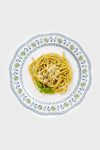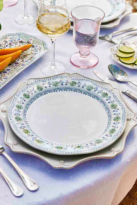 With our heads in the clouds and our feet on the cobblestone streets of ancient Seville, we dreamt up this intricate floral motif that reimagines the romantic city's hand-painted tiles and patterns, rendered in the organic colors of the Spanish countryside. Equal parts fresh, tranquil, and whimsical, the scalloped rim of this dinner plate is perfect for framing culinary creations and adding a lovely layer to place settings for mixing and matching.
