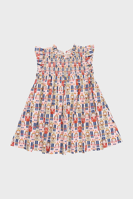 The Vintage Nutcracker Stevie Dress boasts a fluttery ruffled arm, delicate ruffle at the neck and vintage inspired smocking at the chest. Perfect for holiday gatherings, winter celebrations, or family photos, pair it with tights and ballet flats to complete a sweet, seasonal outfit.