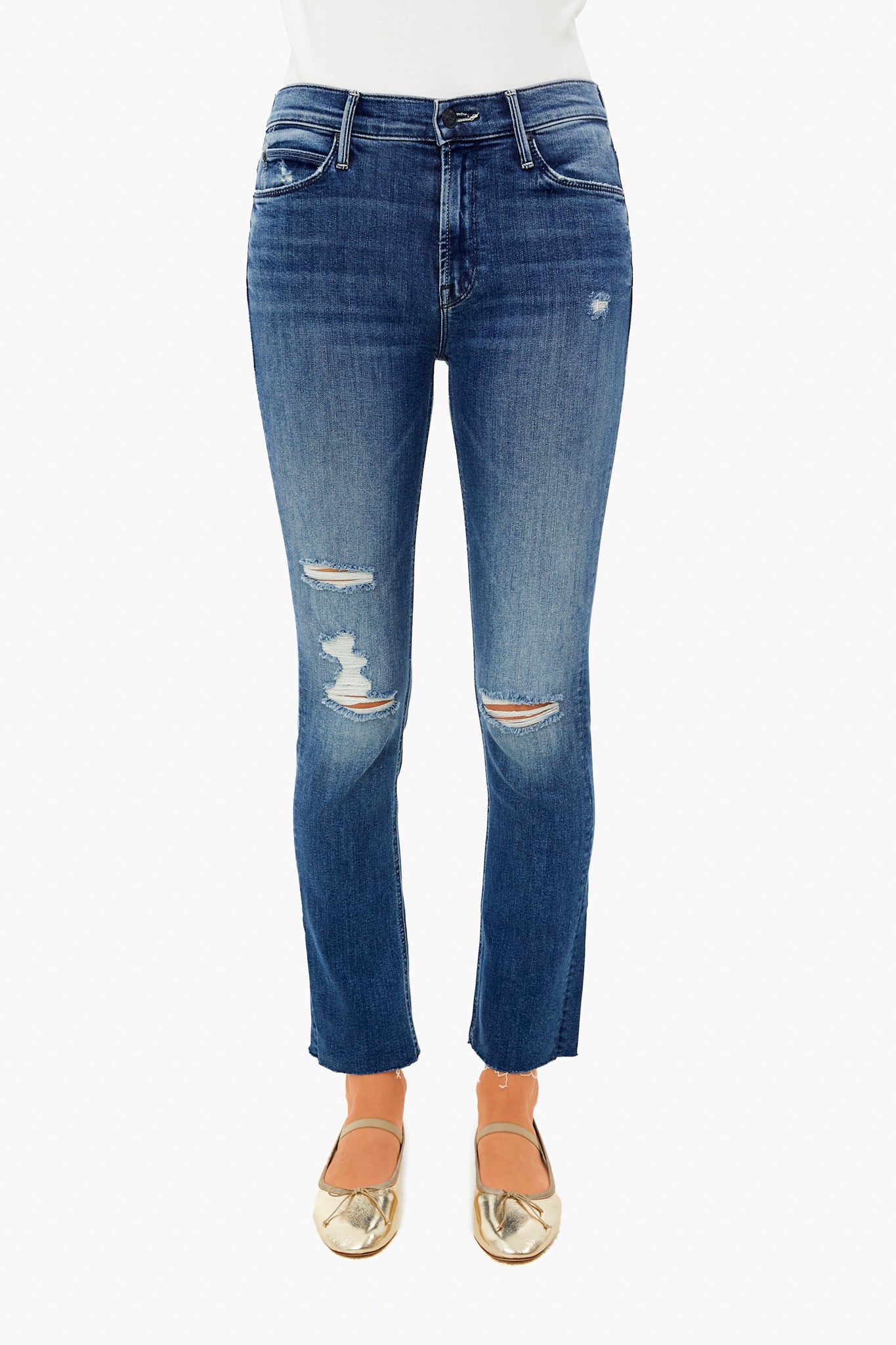 Featuring a cropped, straight leg silhouette with a distressed wash, the Weekend Warrior Mid Rise Dazzler Ankle Fray is Mother’s best-selling straight leg style. We are loving these with flats and a tee for an effortlessly chic look.