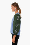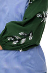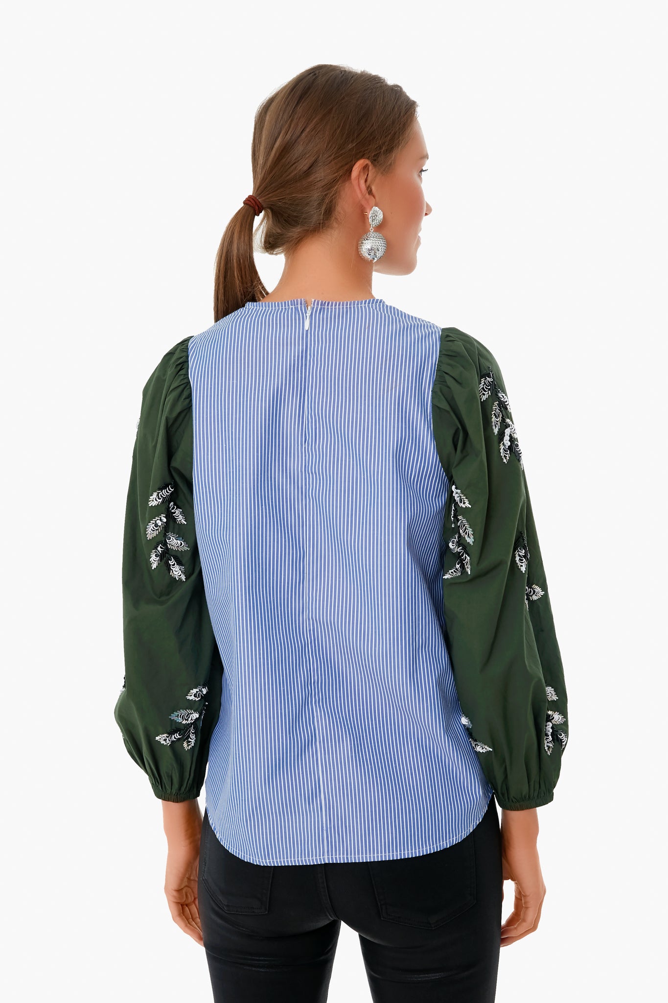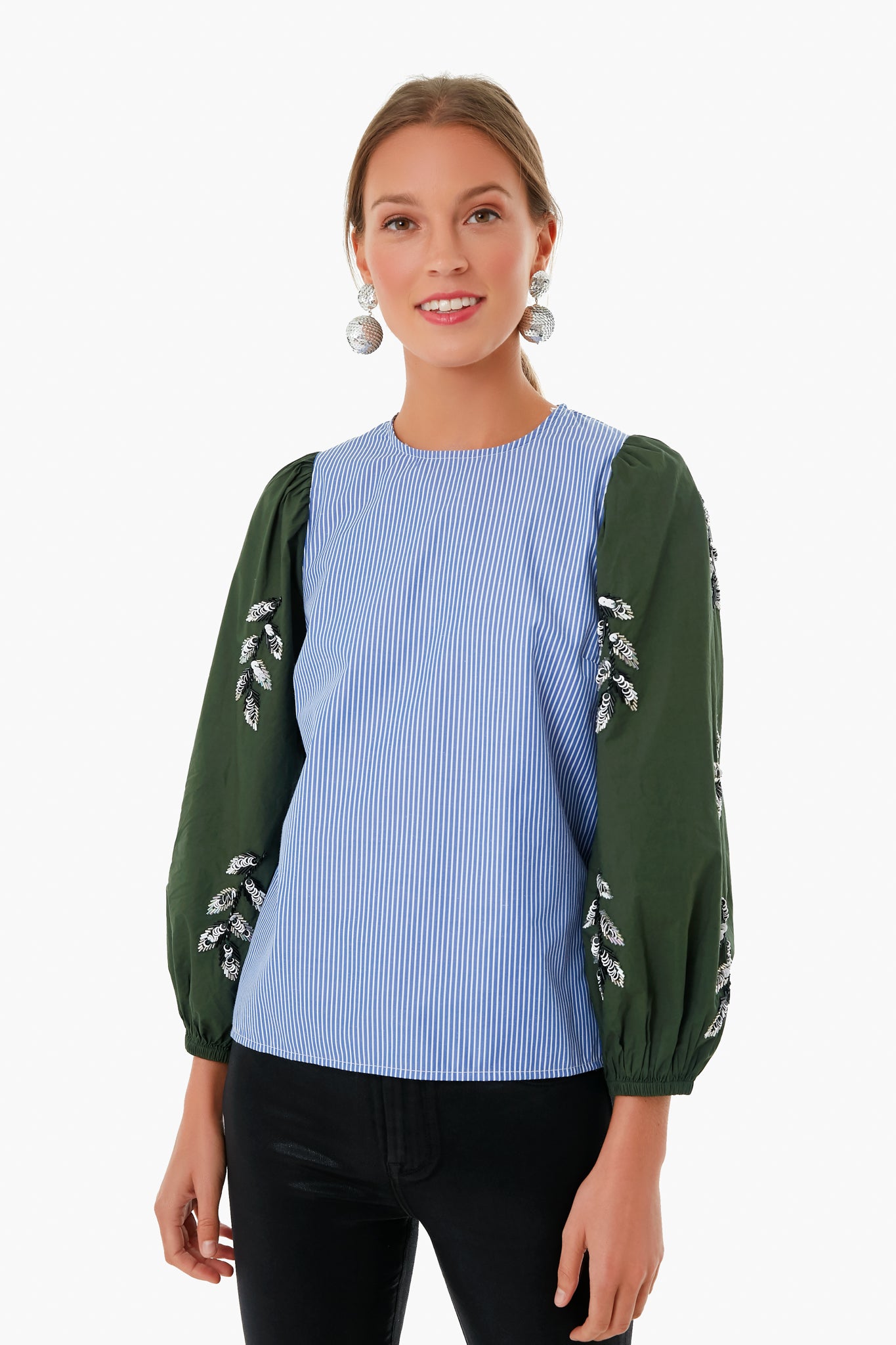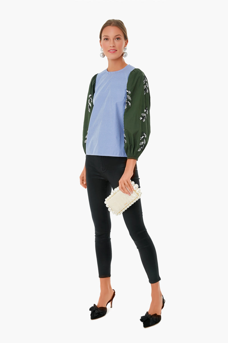 Founded by a husband-and-wife team, Essentiel Antwerp is a Belgian brand known for its colorful textiles and playful details. The Whipple Top is a blue and white striped cotton poplin shirt with green sequin embellished puff sleeves. We are pairing this beautiful and unique blouse with denim and kitten heels for al fresco dining with friends.