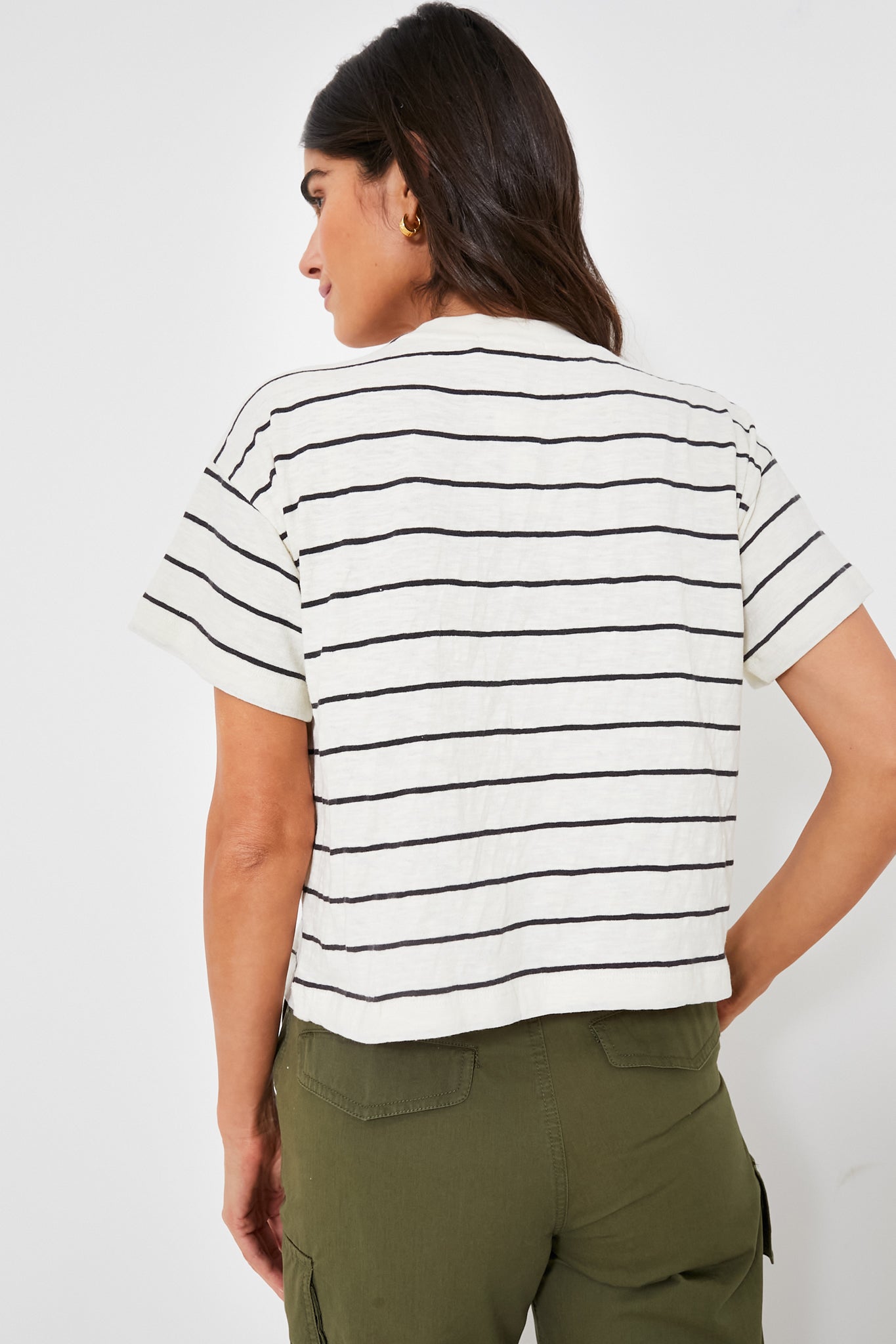 Washed to old-favorite perfection, the White and Black Stripe Heavy Slub Boxy Crew Crop is going to be your new favorite go-to tee. Perfect for transitioning seasons, it is made from heavyweight material and has been garment-dyed for a broken-in, sun-faded look. Classically chic, it pairs perfectly with pants, shorts, skirts, you name it.
