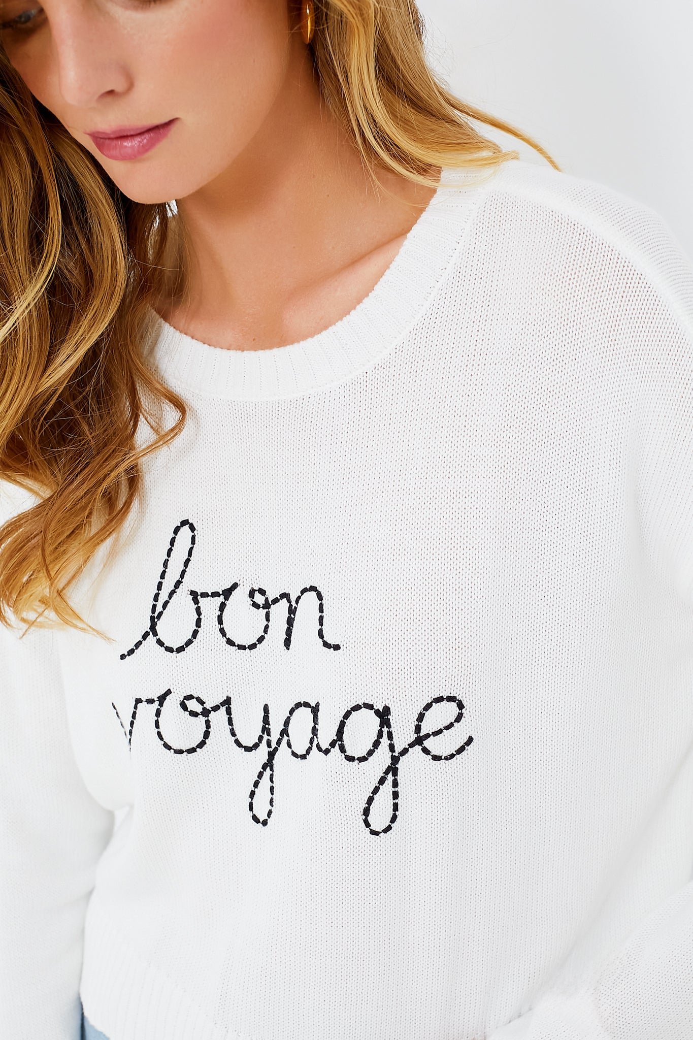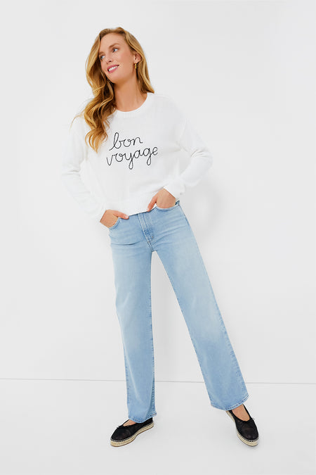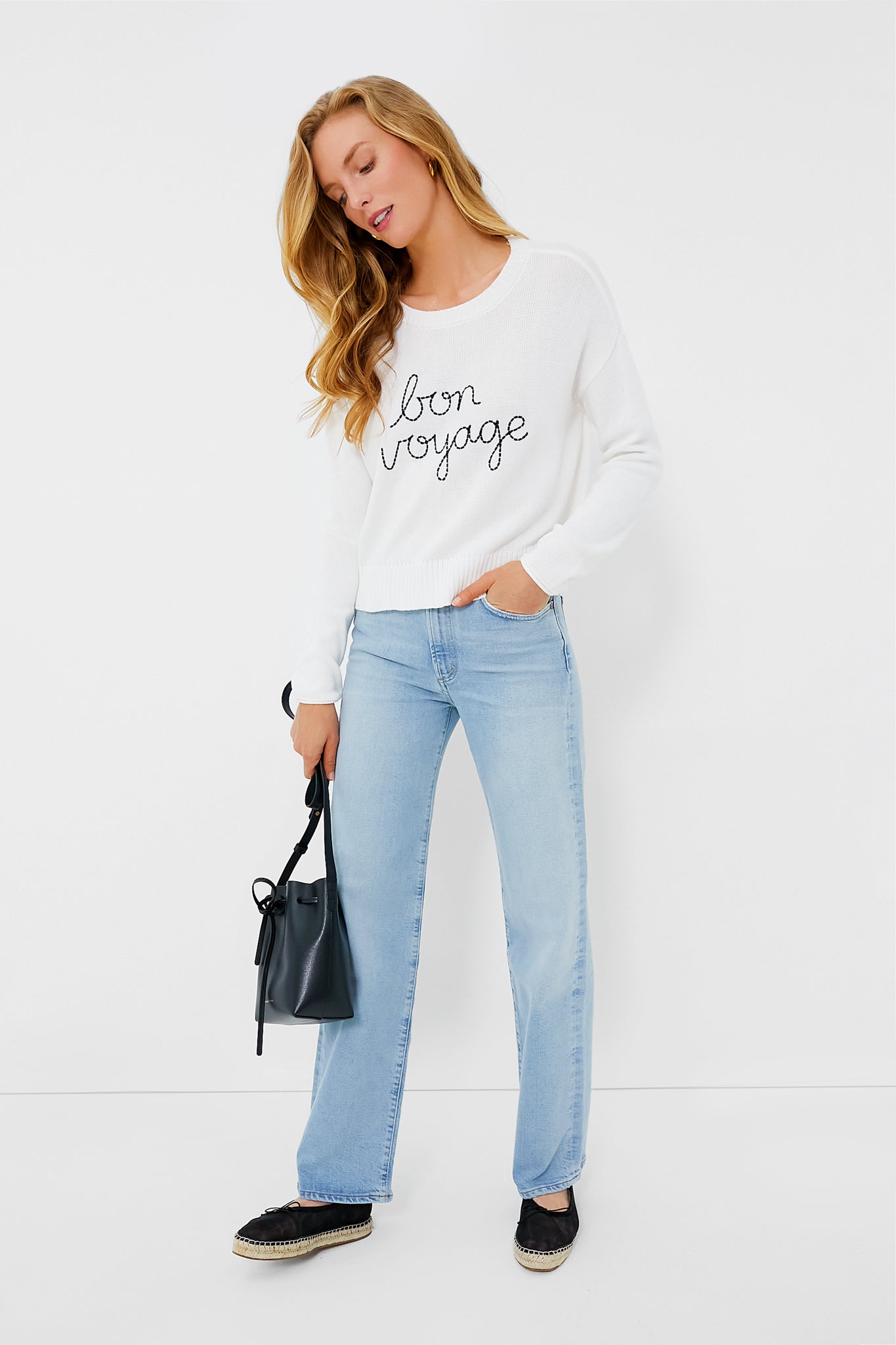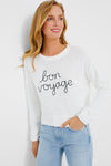 Dreaming of travel? You will love the irresistibly soft White Sienna Sweater. This relaxed silhouette features a crew neckline, ribbed hem, and embroidered "Bon Voyage" slogan on the front. An easy style to wear year-round, we are pairing this with leather pants and boots for the winter and denims shorts and ballet flats for the summer!