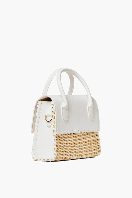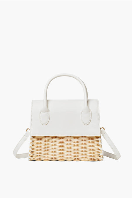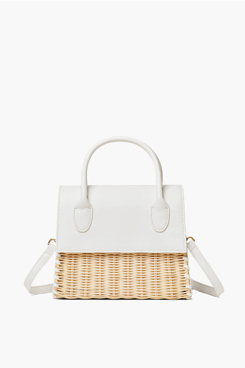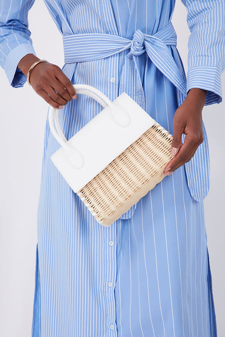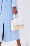 Timeless in shape, yet plenty modern due to a mixed-material composition that brings a fun edge, the White Caspian Bag is the epitome of elevated summer accessorizing. Top handles and an optional crossbody strap give you multiple options of how to carry it, while a brightly hued vegan leather contrasts with the natural woven basket-texture to create a stunning visual effect. Pair with a classic button down and white denim for a chic everyday styling, or with a printed dress to take things up a notch.