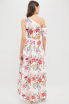 The White & Coral Floral Sophia Maxi Dress is a gorgeous evening gown for your next special occasion. With an asymmetrical top, side cut out, pleated skirt, you are sure to stand out with this dress! Pair with heels, a rattan handbag, and jewelry for a picture perfect look!