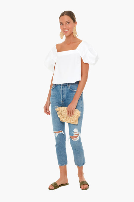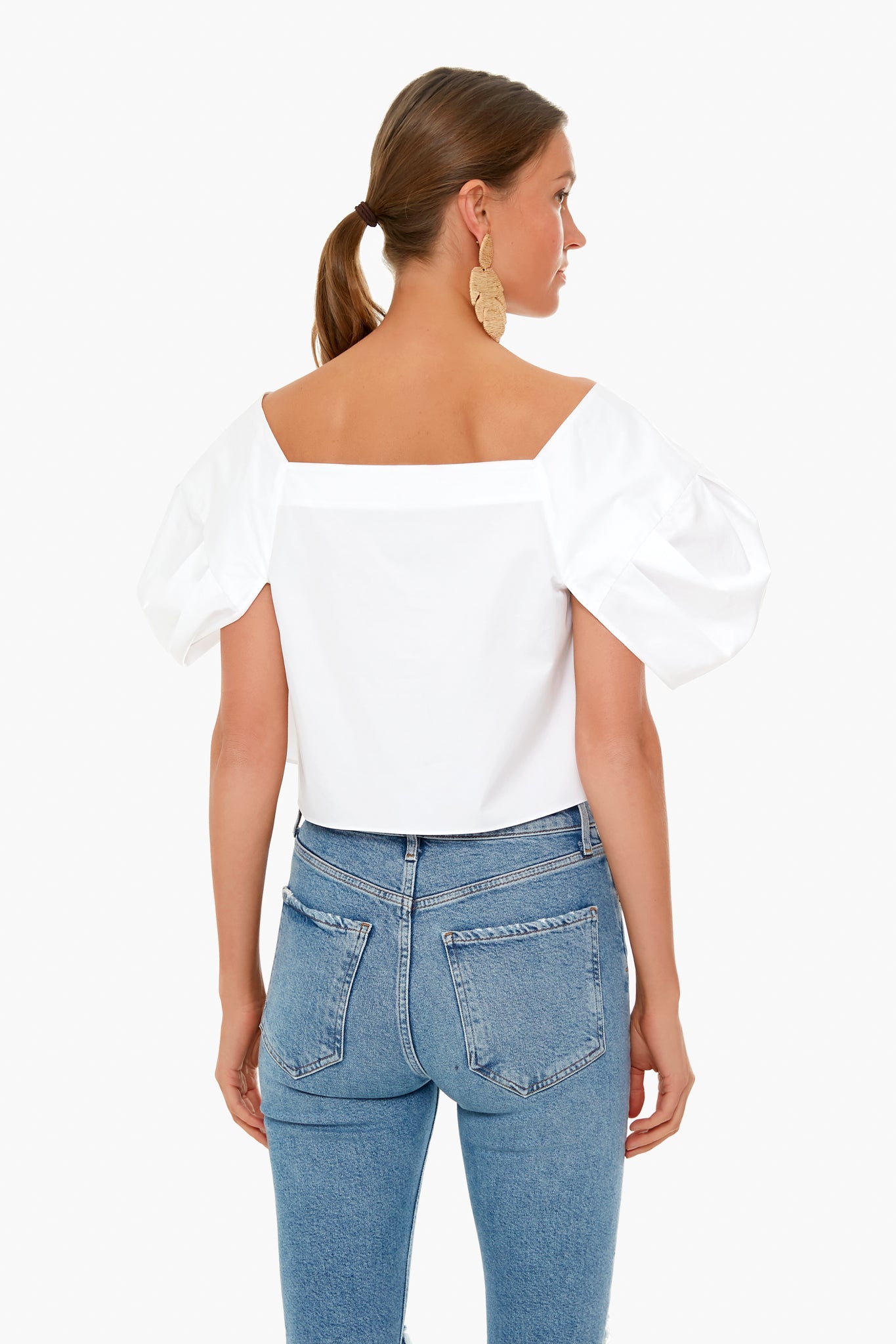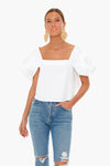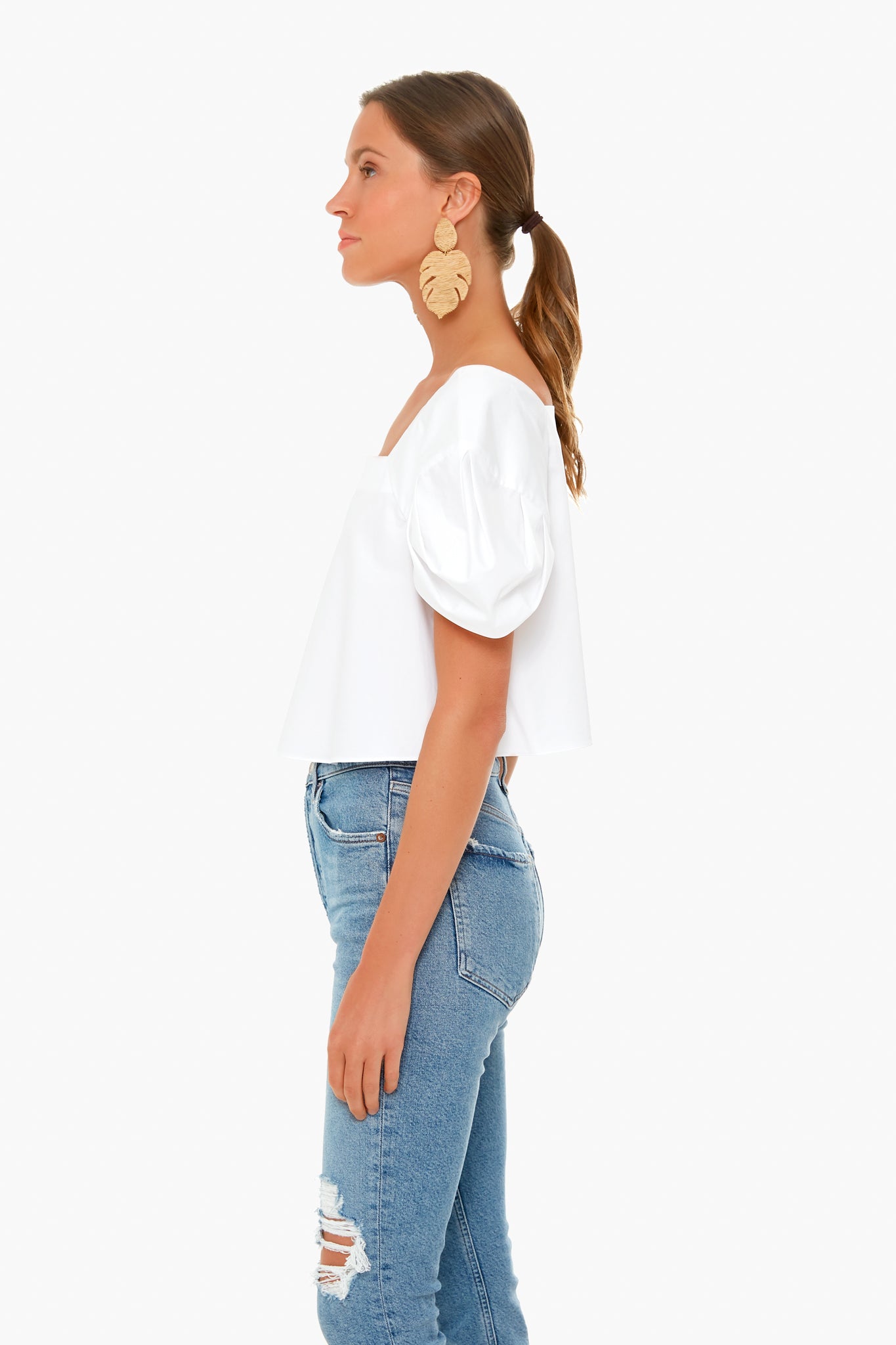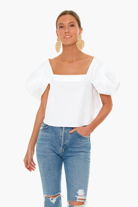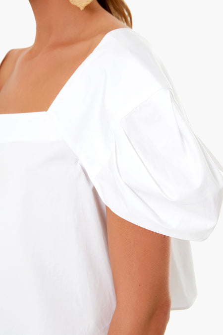 The White Eco Poplin Square Neck Top features a flattering square neckline and sculptural cap sleeves. This modern blouse is made from certified organic cotton, making it comfortable in any weather. Pair with denim and raffia accessories for a casual and chic look!