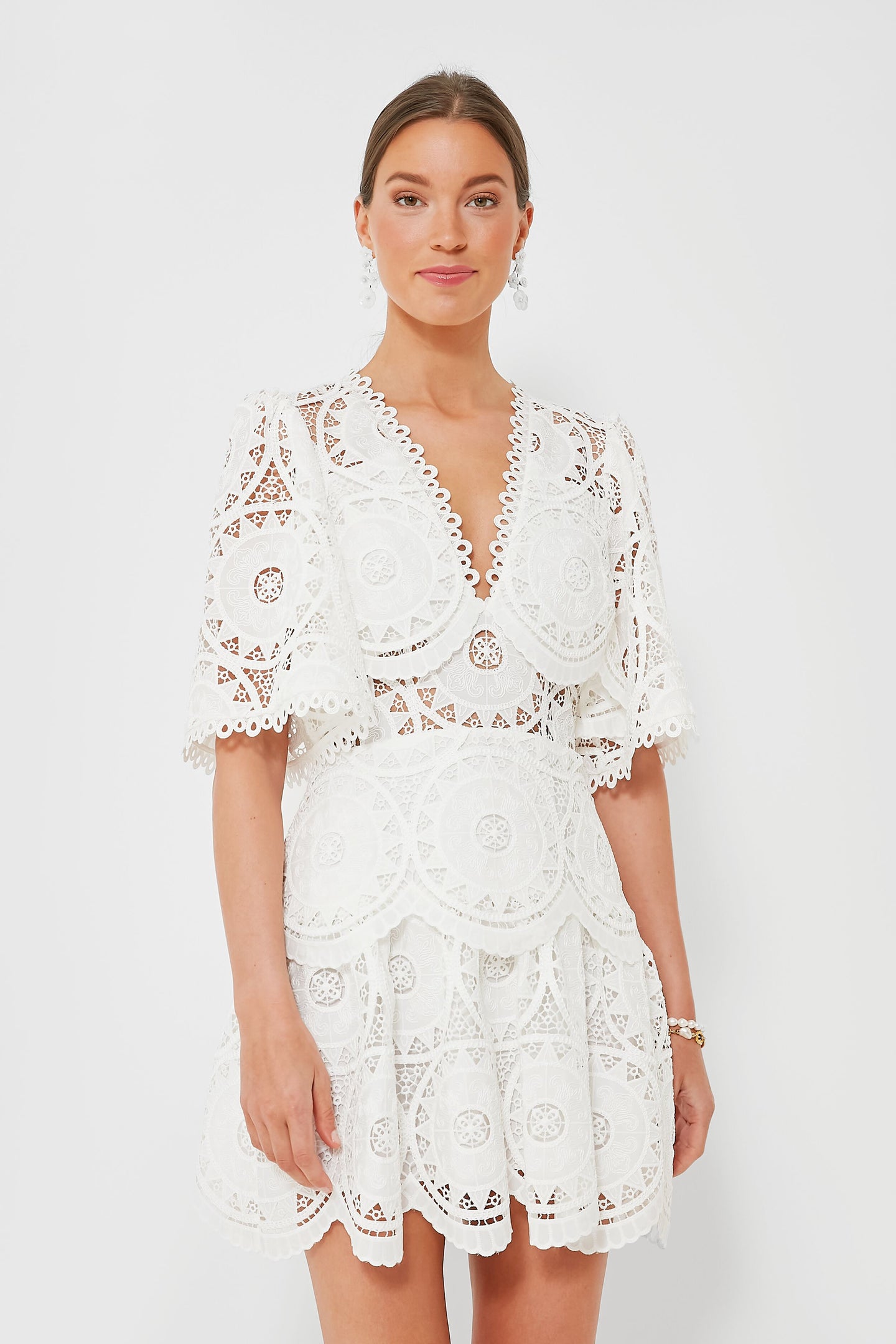 The perfect choice for upcoming sunny celebrations, the Ethereal Pia Dress is breathtakingly beautiful. In a bright white colorway and covered in all-over lace that adds a fresh and feminine detail, this mini features a deep V-neckline, short flared sleeves with a slightly puffed shoulder, and an A-line skirt with a scalloped hem. We love to wear it for cocktail parties and events with heels and a clutch, but you could totally dress it down with sandals and colorful jewelry for a pop of fun.