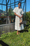 A beautiful eyelet lace floral fabric, a trapunto-stitched belt that can cinch the waist or be left off for a relaxed feel, and side pockets! You can clearly see why we have been loving the White Prescott Dress. This elegant and elevated maxi has details in droves — we already mentioned a few but it's also got a chic band collar and angled short sleeves that provide a touch of structure. The versatile dress-up-or-down number your closet has been needing, all you have to do is add flats, sneakers, heels, or boots for a perfect and polished look.