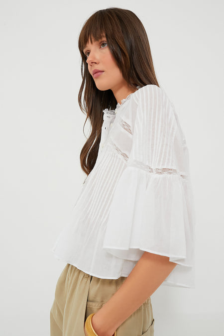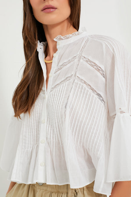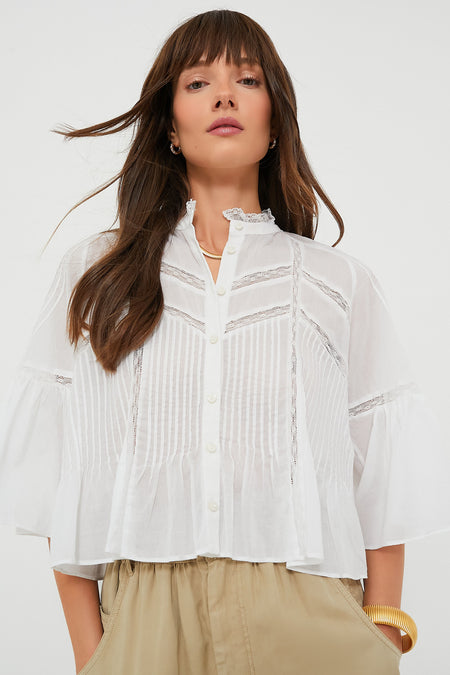 Understated yet unique, this White Gramy Blouse is cut for a swingy and boxy fit. This feminine style features a stand collar, flared quarter length sleeves and an elaborate arrangement of openwork lace details and pleats all over. Pair this neutral number with a flowy maxi skirt and espadrilles for a boho-chic look, or with denims and statement jewelry for an outfit that is perfect for dining al fresco.