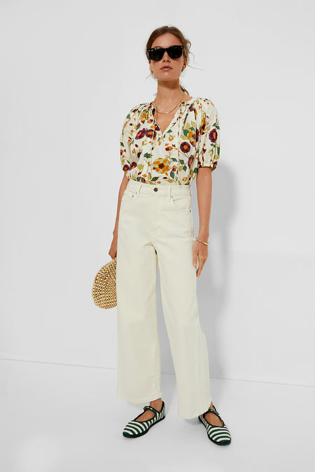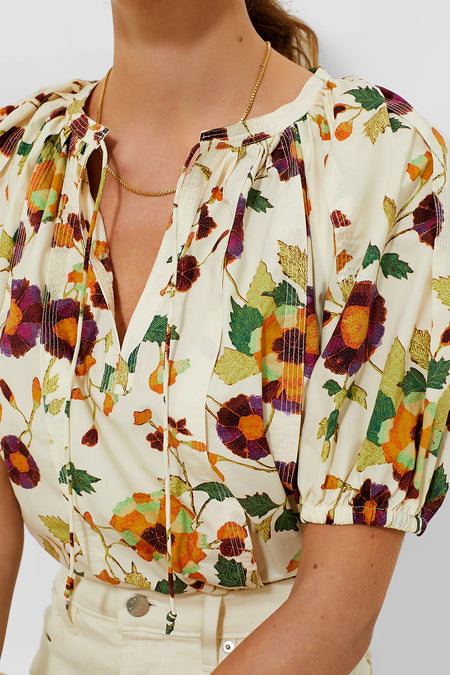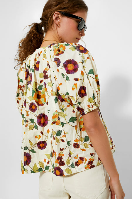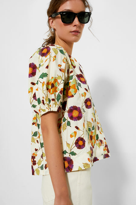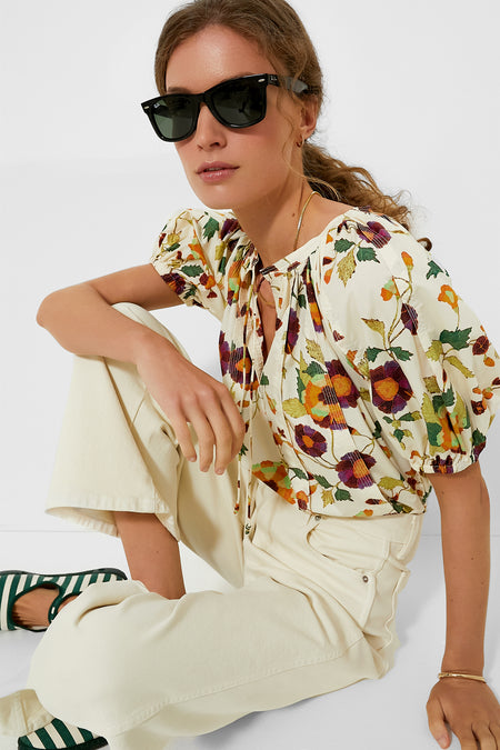 The White Iris Loli Top is as versatile as it is timeless. This feminine beauty is made from crisp poplin with cascading bouquets that come alive against a vintage, batik-inspired backdrop. Featuring cream, pink, and orange hues, this breezy blouse is adorned with voluminous puff sleeves and delicate ties at the neck. Pair with dark wash denim and ballet flats for an elevated everyday look.