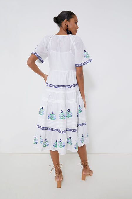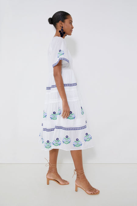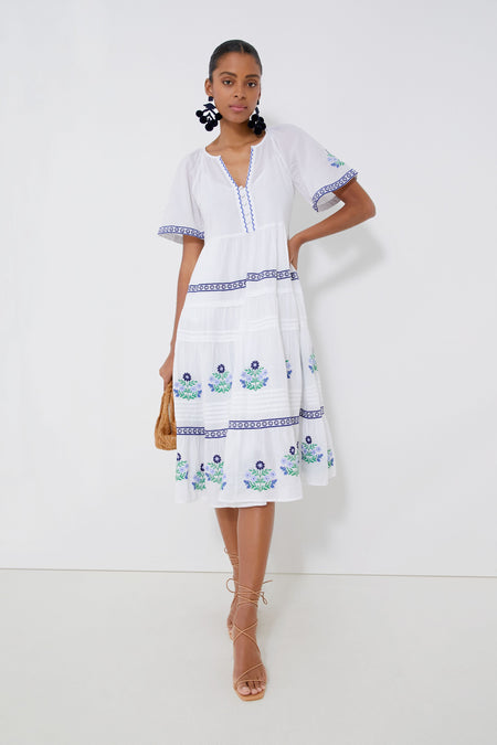 Oh, sew nice! Made of 100% cotton and fully lined, the White Multi Carlene Dress is a modern take on the LWD. A stylish way to stay cool, this flirty frock features a flattering V-neckline, tiered skirt, and delicate embroidered detailing throughout. Plus, the midi length is equally cute with sneakers or heels– layer on a cardigan for cooler nights or to wear well into the fall.