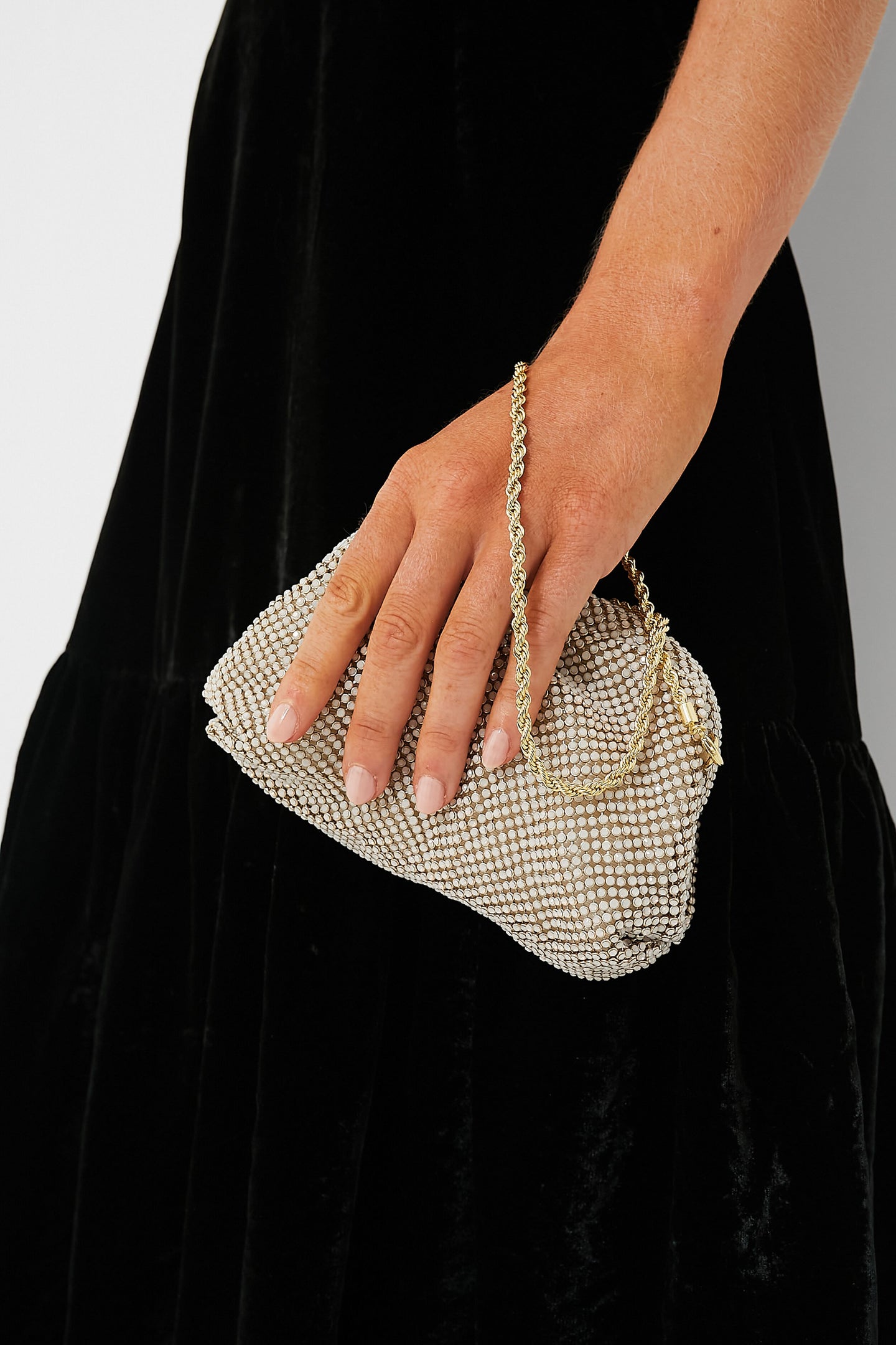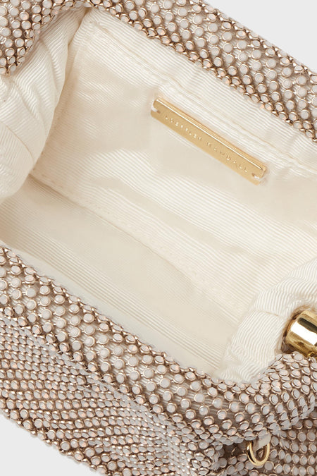 Made of a stunning diamanté mesh full of shimmer and shine, the White Opal Doris Micro Clutch is exactly the type of event-ready accessory you need to add to your collection. It features a removable twisted gold metal chain strap so you can carry it on the shoulder or in hand, a secure frame closure, and an interior slip pocket. Add a little glam to your look with this gorgeous bag, and pair it with everything from mini dresses to evening gowns.