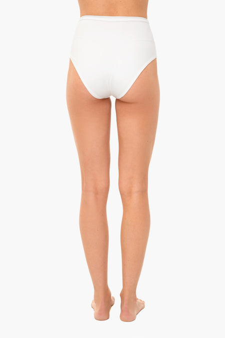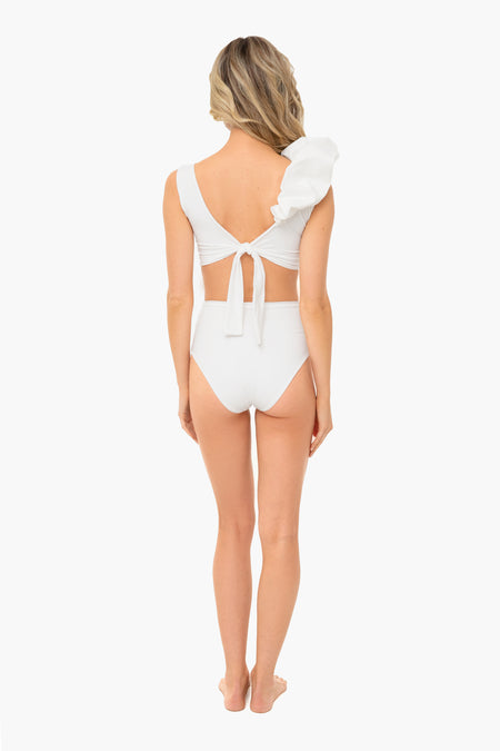 The Rose Two Piece blends couture construction and swimwear. This swimsuit has high waisted bottoms with a V-neckline and puff detail on one shoulder. Dramatic and oh-so-chic, this style is a must-have for your next day by the water!