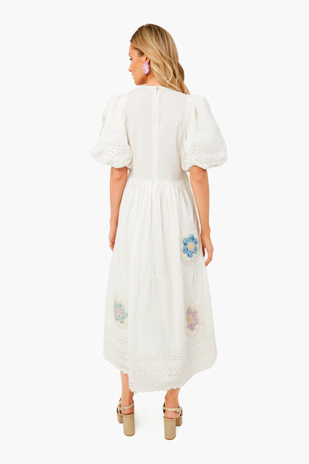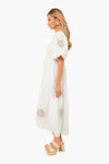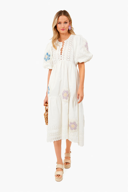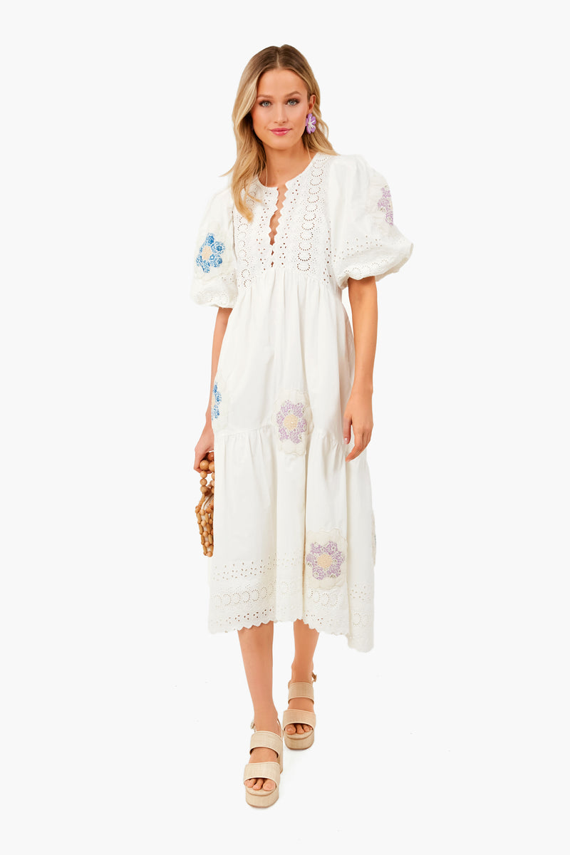 The Violette floral patch midi dress features puff sleeves, v-neckline, floral patches and eyelet detailing. Made from a wearable cotton fabric, this style is feminine and effortless. Pair with raffia accessories and sunglasses for a picnic in the park!