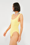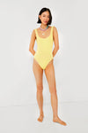 The Yellow Square Neck One Piece features an updated angular square neckline and a scooped low back to show off some sun-kissed skin. With a thick shoulder strap width that provides comfort and support without subtracting style, this swimsuit hugs the body in all the right places thanks to the textured crinkle material, which stretches and retracts to give shape without losing it’s own.