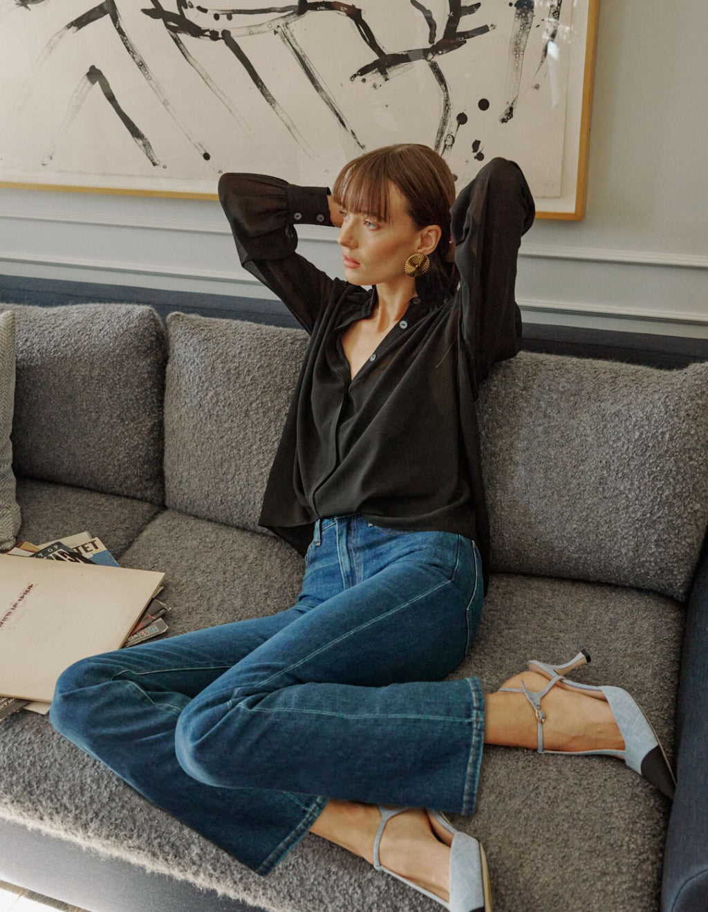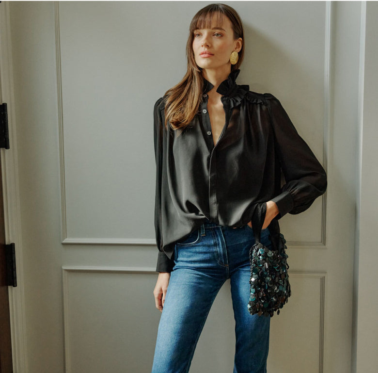 A black blouse is a piece to wear on repeat, and this one’s sheer overlay and romantic ruffles add a daring edge. It’s the perfect minimal update to your night-out top.