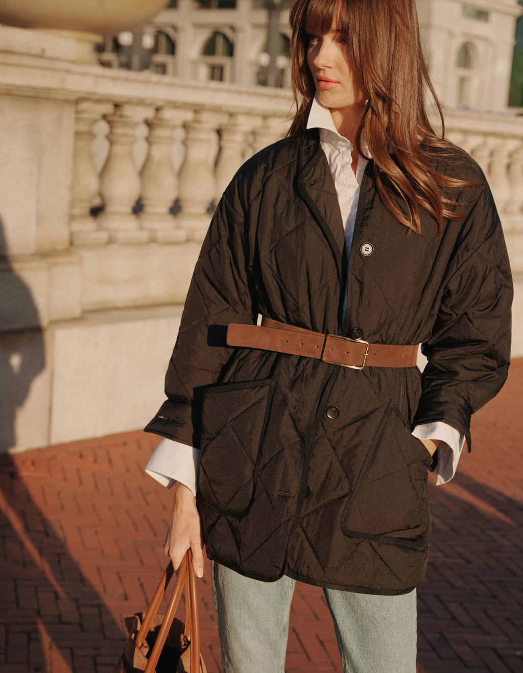 A collarless, plush quilt is the lightweight layer that will see you seamlessly from winter to spring. With its relaxed shape, it’ll go with either your chunkiest knits or your simplest tees for your work-to-weekend uniform.