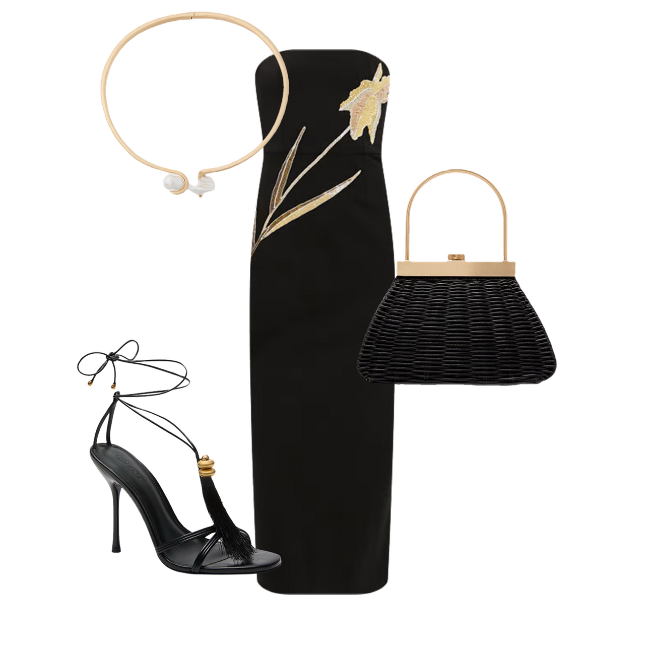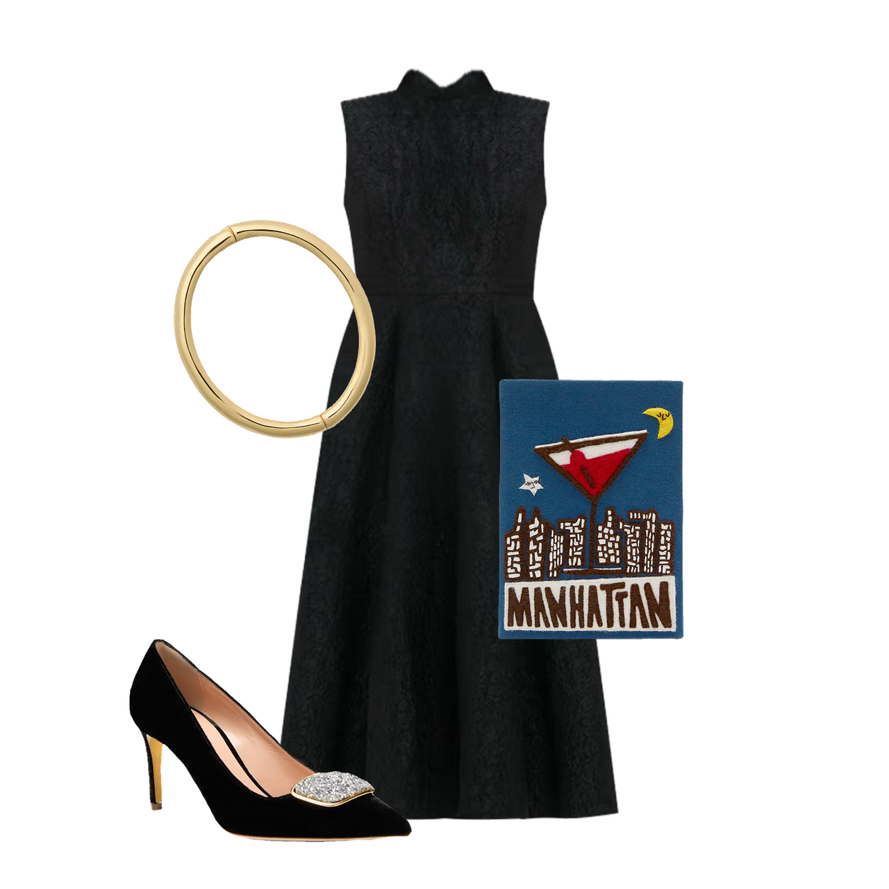 Cocktail dressing isn’t about having a dozen statement pieces—it’s about the right ones, always ready. With a classic black heel, a strappy sandal, a metallic evening bag, diamond studs, and a statement cuff, you’re set. Everything else is layering in personality.